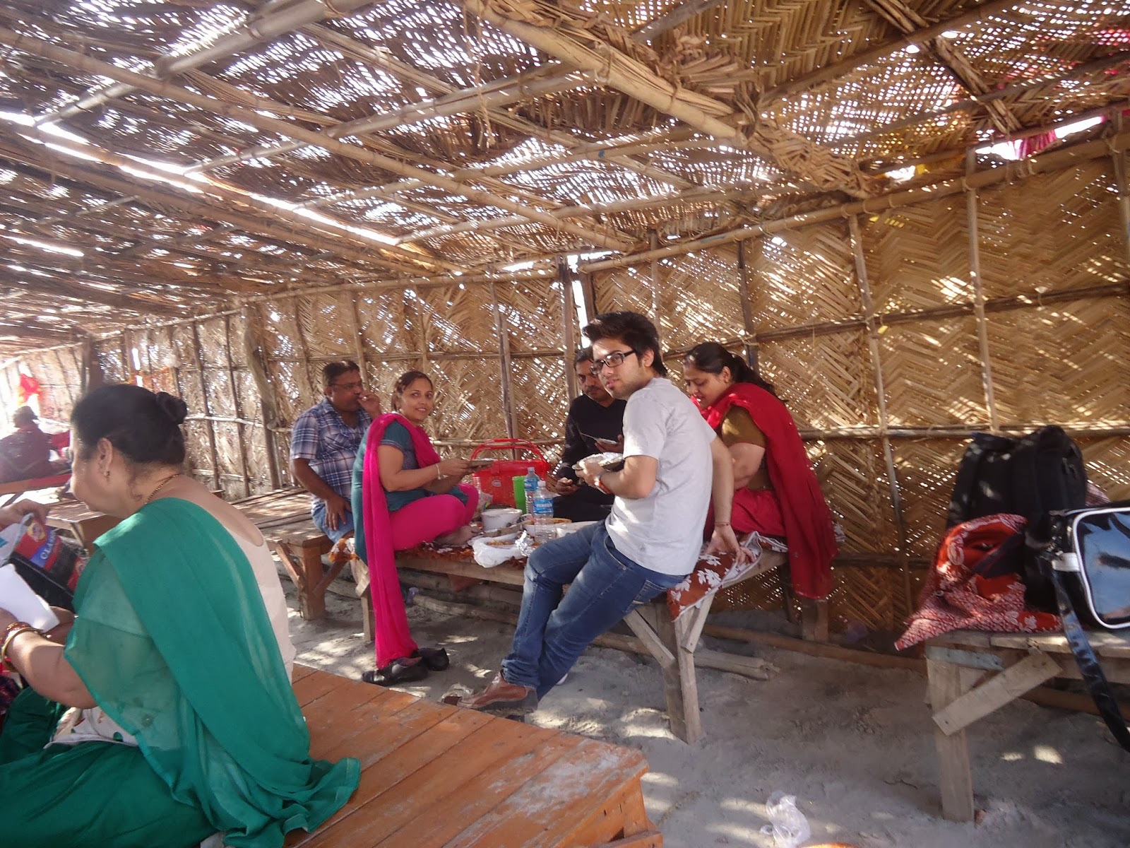 वहाँ पहुंचकर हमने घाट के नजदीक कोई होटल या गेस्ट हाउस वगेरह ढूंडना चाहा एक ही गेस्ट हाउस मिला वो भी इतना गन्दा था की हमने उसे ना लेने का निर्णय बनाया क्योंकि हमें सिर्फ कपड़े वगेरह बदलने के लिए ही इसकी जरुरत थी |वैसे घाट के पास बहुत सारी फानूस की बनी हुई झोंपड़ीयां हैं जो किराये पर मिलती हैं जैसा की चित्रों में दिखाया गया है |